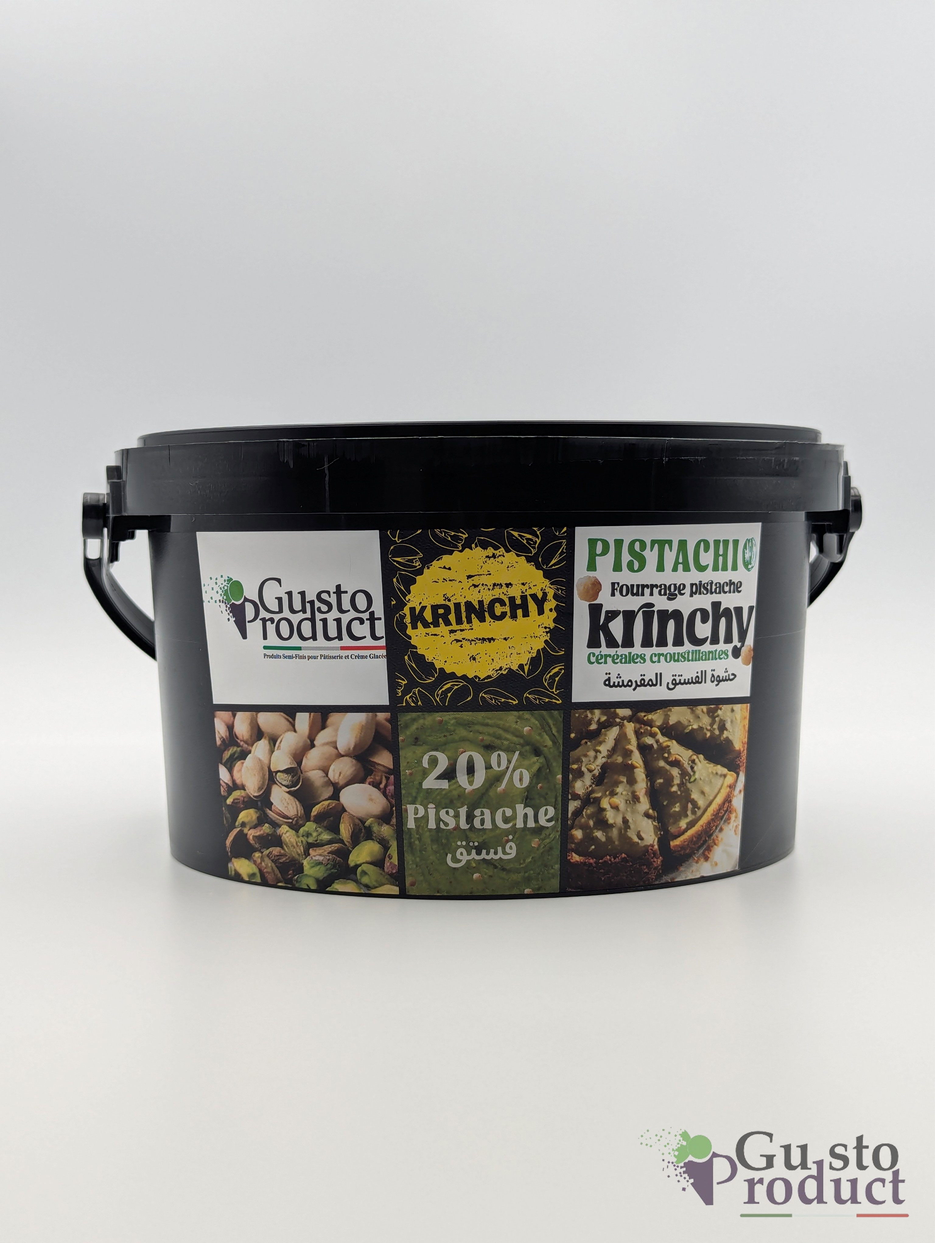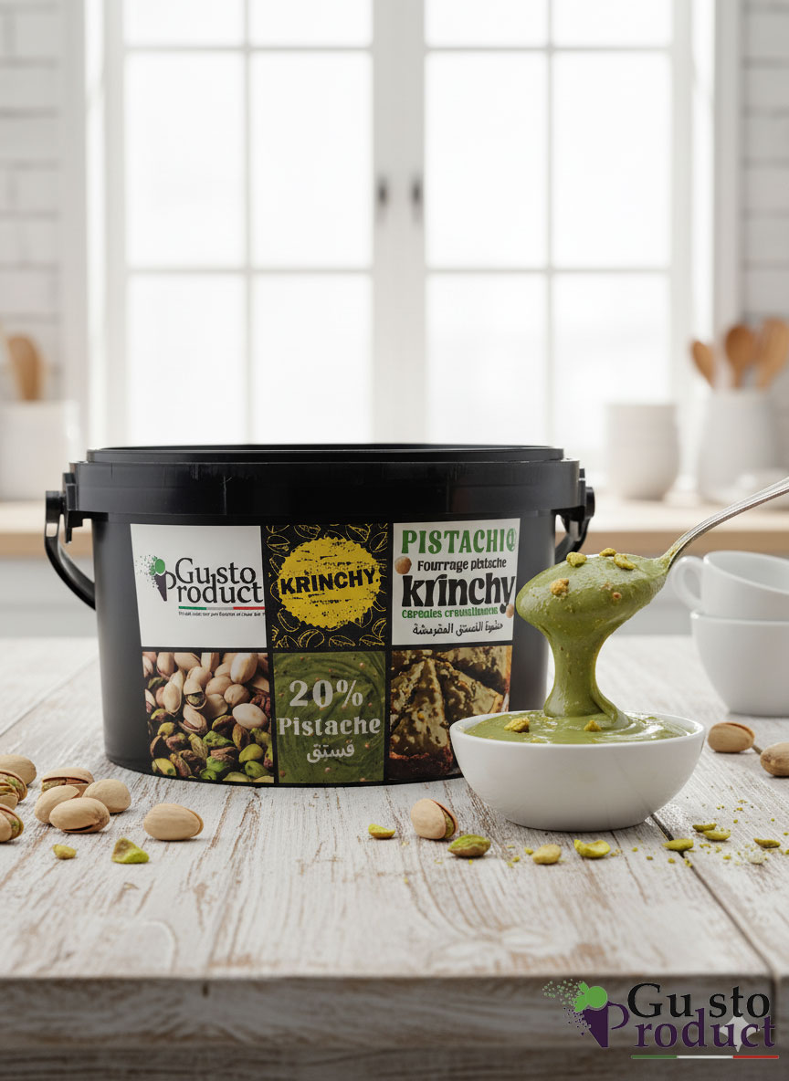 Le fourrage pistache Krinchy de Gusto Product est une crème onctueuse à la pistache, agrémentée d’éclats croquants qui apportent une touche gourmande et originale. Sa texture unique, à la fois fondante et croustillante, en fait un choix idéal pour garnir vos gâteaux, crêpes, beignets ou pâtisseries. Avec son goût raffiné de pistache et son effet « krinchy », il séduit aussi bien les amateurs de douceurs que les passionnés de pâtisserie.